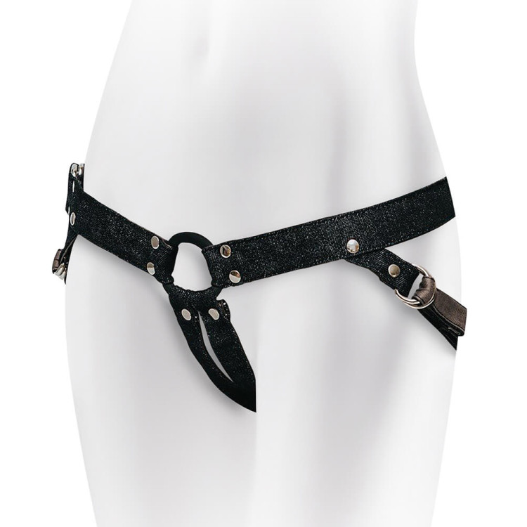 Eksklusiv, håndlaget strap-on harness av sort denim på utsiden og mykt tøy på innsiden. Selve selen er justerbar og passer de fleste. To av stroppene går mellom lårene, opp til siden av hoftene og av den grunn er denne selen svært komfortabel under bruk!