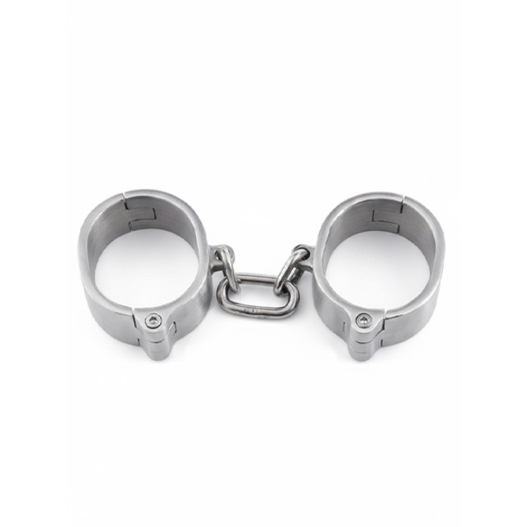 Mansjettene har avrundede kanter som gir bedre komfort mot huden, samtidig som de beholder et stramt og industrielt preg. Hver mansjett låses og åpnes med medfølgende unbrakonøkkel, noe som gir et mer kontrollert låsesystem enn tradisjonelle nøkler. Kjettingen mellom mansjettene er sveiset for ekstra styrke og stabilitet. Her kommer du deg virkelig ikke unna.