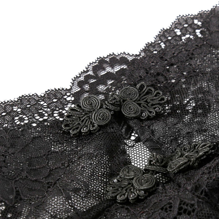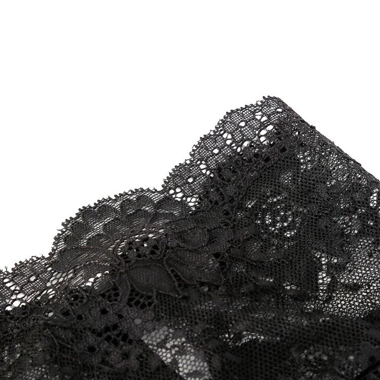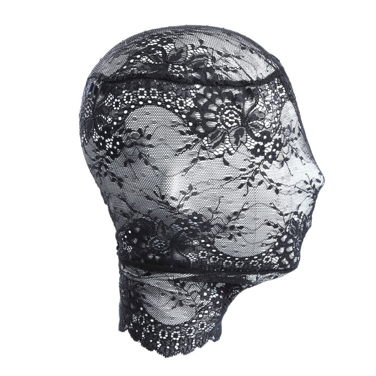 Sort, tettsittende blondemaske uten åpning for munn/øyne, men blondemønsteret gjør det mulig å se/puste gjennom materialet.