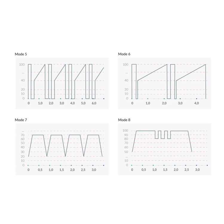 Hvert E-stimulerings program er laget for å skape en ny og pirrende sanseopplevelse. Hvert press på e-stim knappen tar deg til neste program. Vær oppmerksom på at rytmeprogrammene (2 og 4) trenger 3 sekunder for å nå den høyeste intensiteten på programmet. Elektroleker stimulerer nerveendingene og gir deg en helt ny opplevelse. Kanskje du blir hektet?