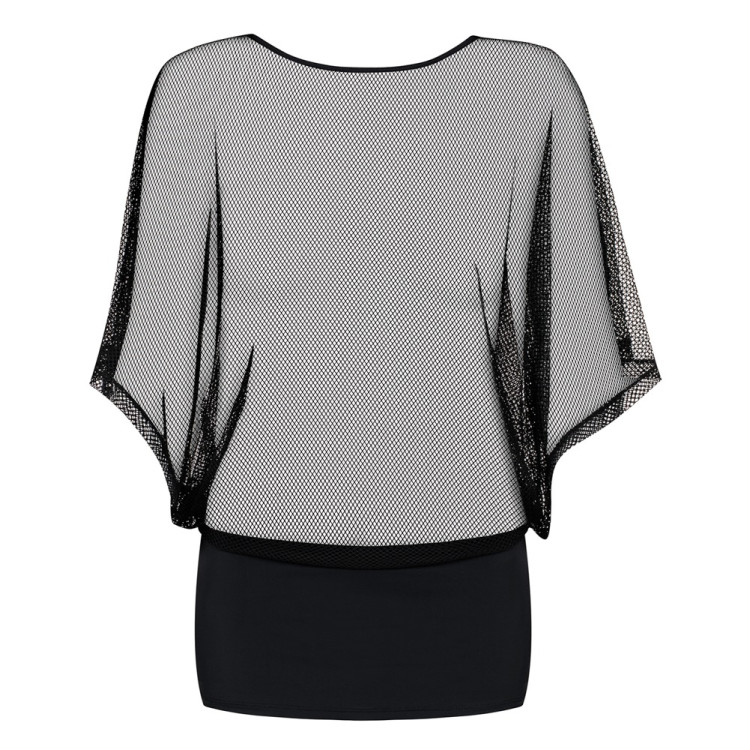 Sort minikjole med vid, gjennomsiktig overdel og tettsittende miniskjørt.