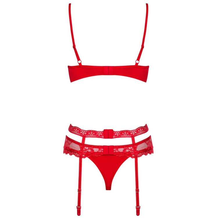Dette forførende undertøysettet i knallrødt kommer med en BH, hofteholder og matchende g-string. Blondemønsteret og rødfargen gjenspeiler seg i både BHen, den brede strømpeholderen og i g-stringen.