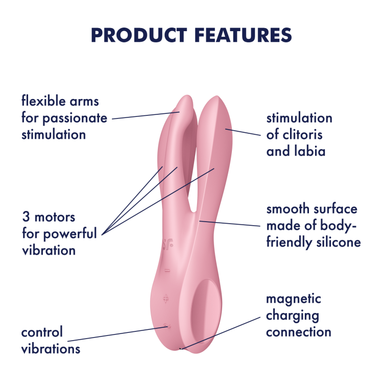 Den har 3 kraftige motorer, to på sidene og en på toppen, slik at du får klitorisstimulering fra alle sidene. Dette gir deg en komplett og intens stimulering fra alle kanter! Threesome 1 har en rettere form enn andre Threesome varianter, og det er derfor enkelt å få en presis stimulering.